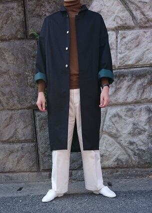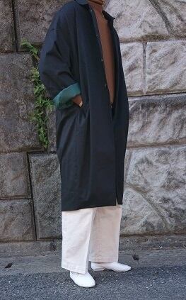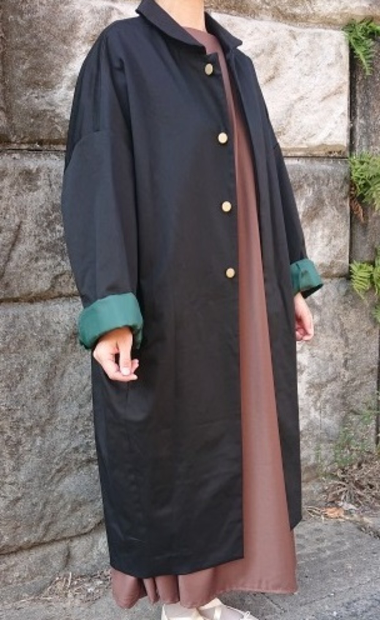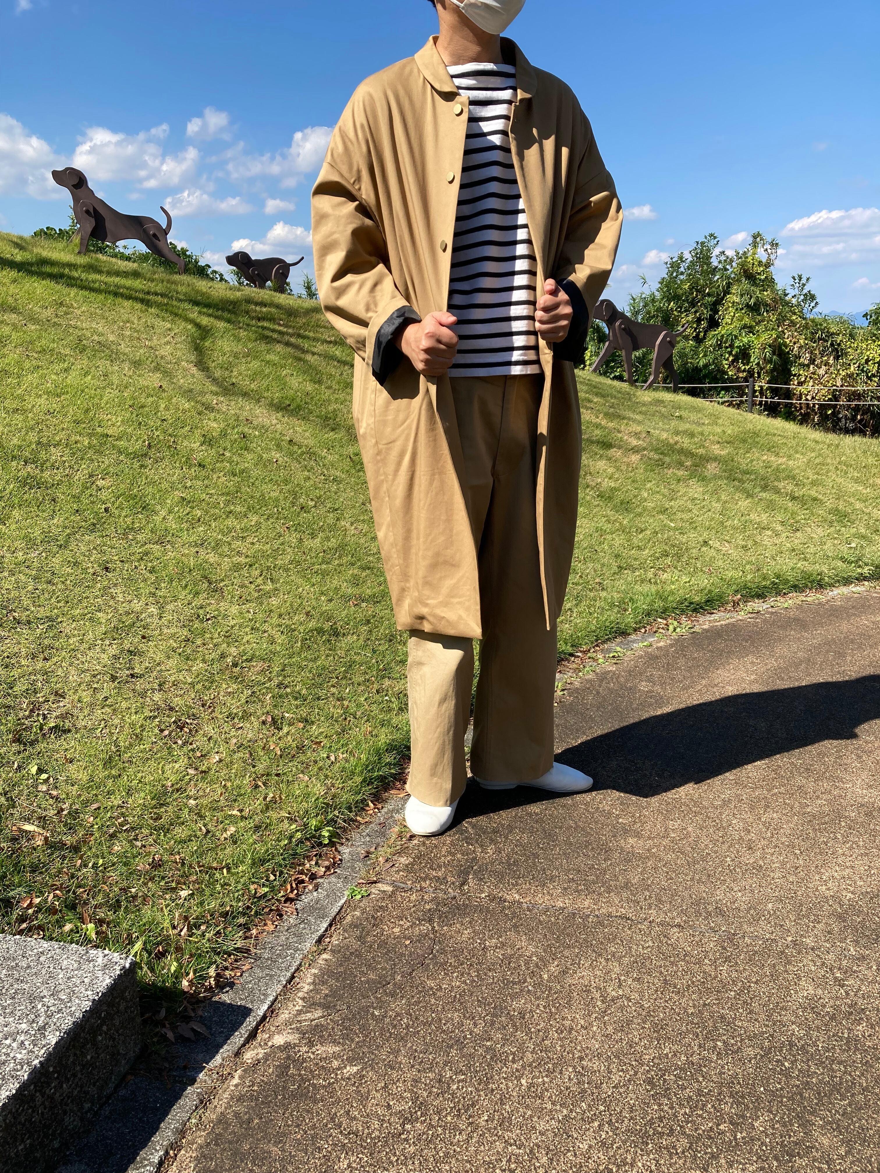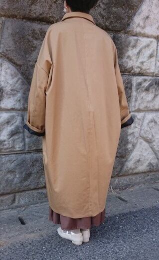 ボリュームのあるコクーンシルエット、丸衿、金ボタンのデザインで、細部にまでこだわりを詰め込みました。