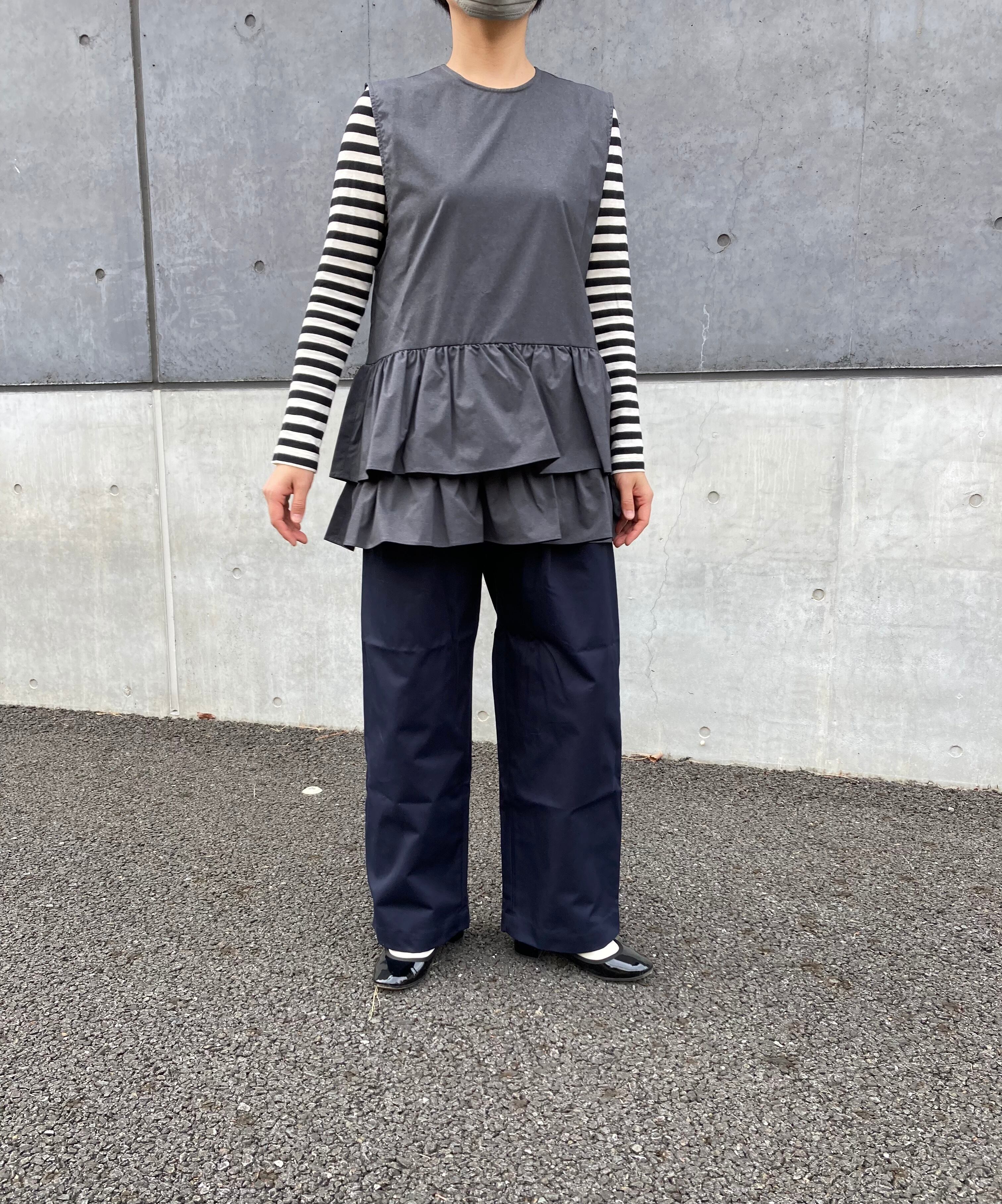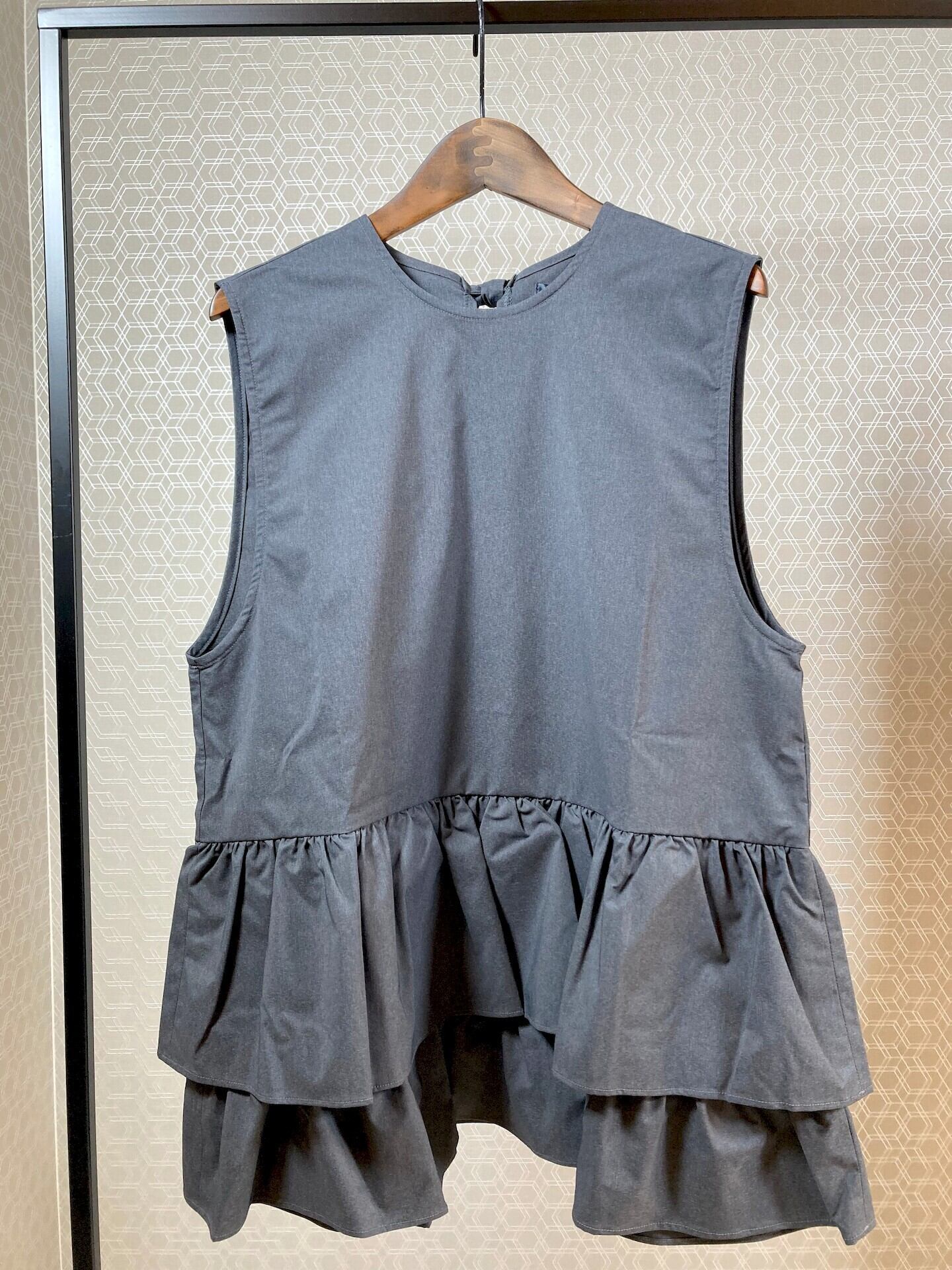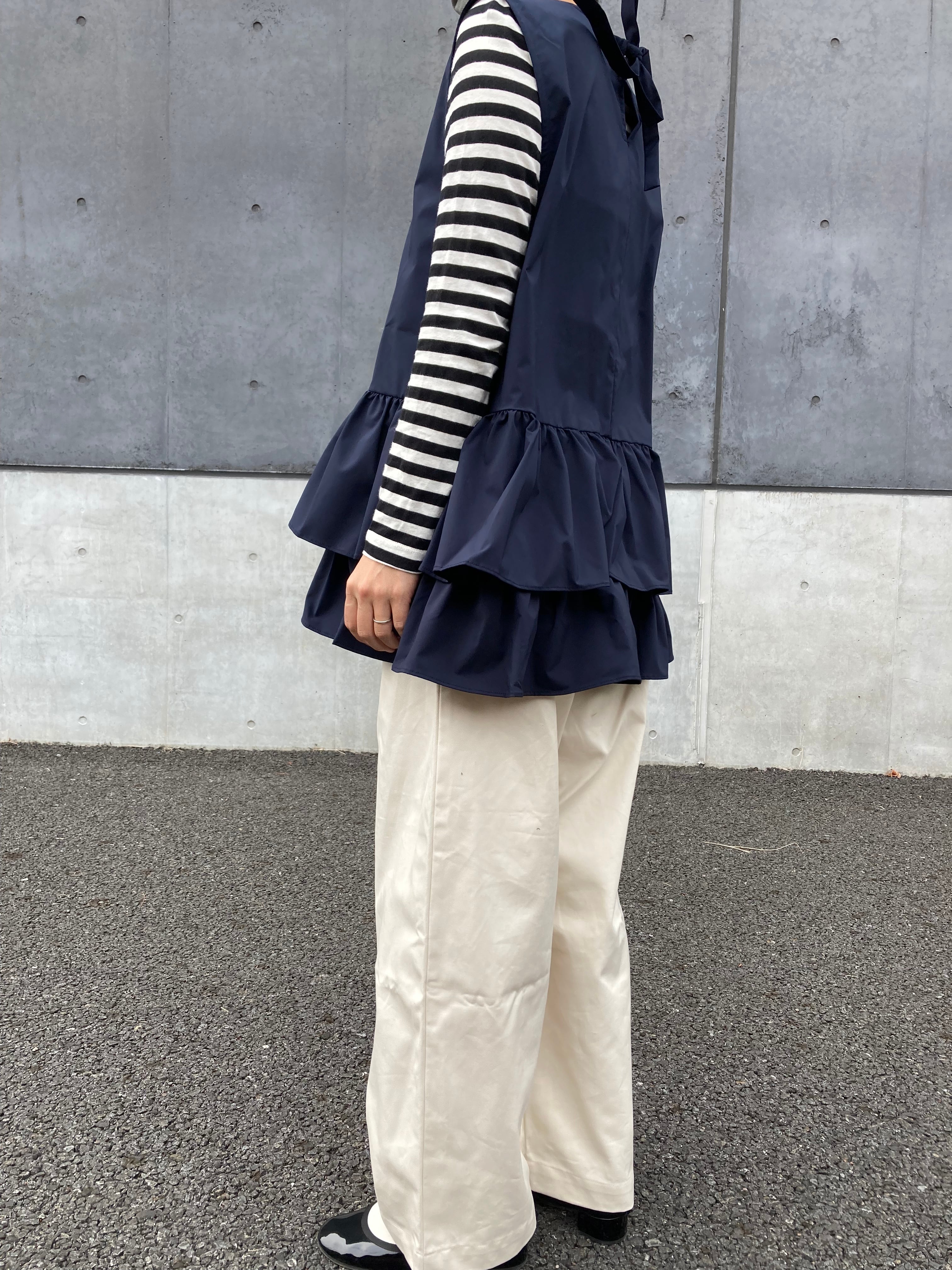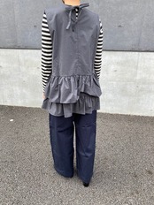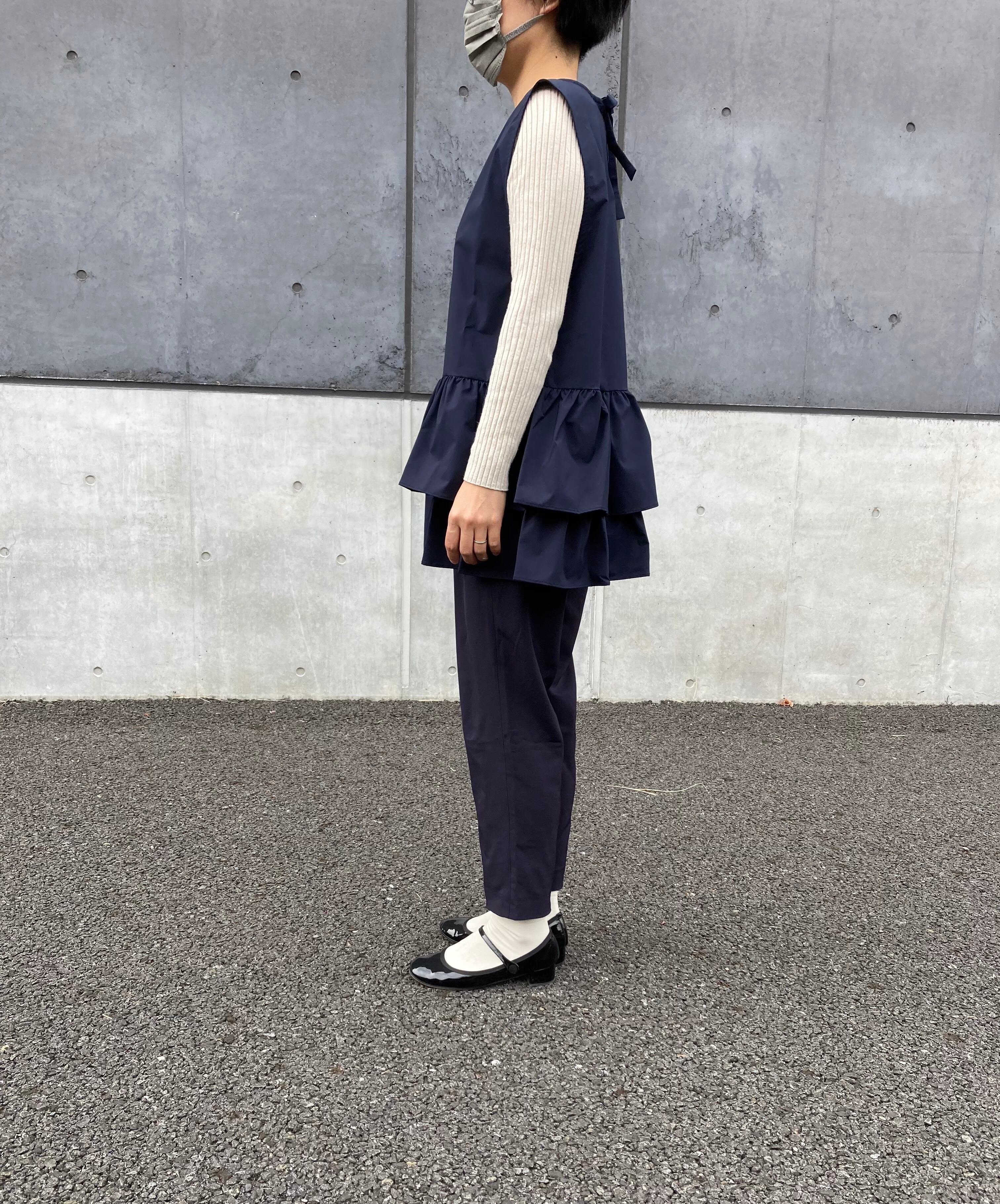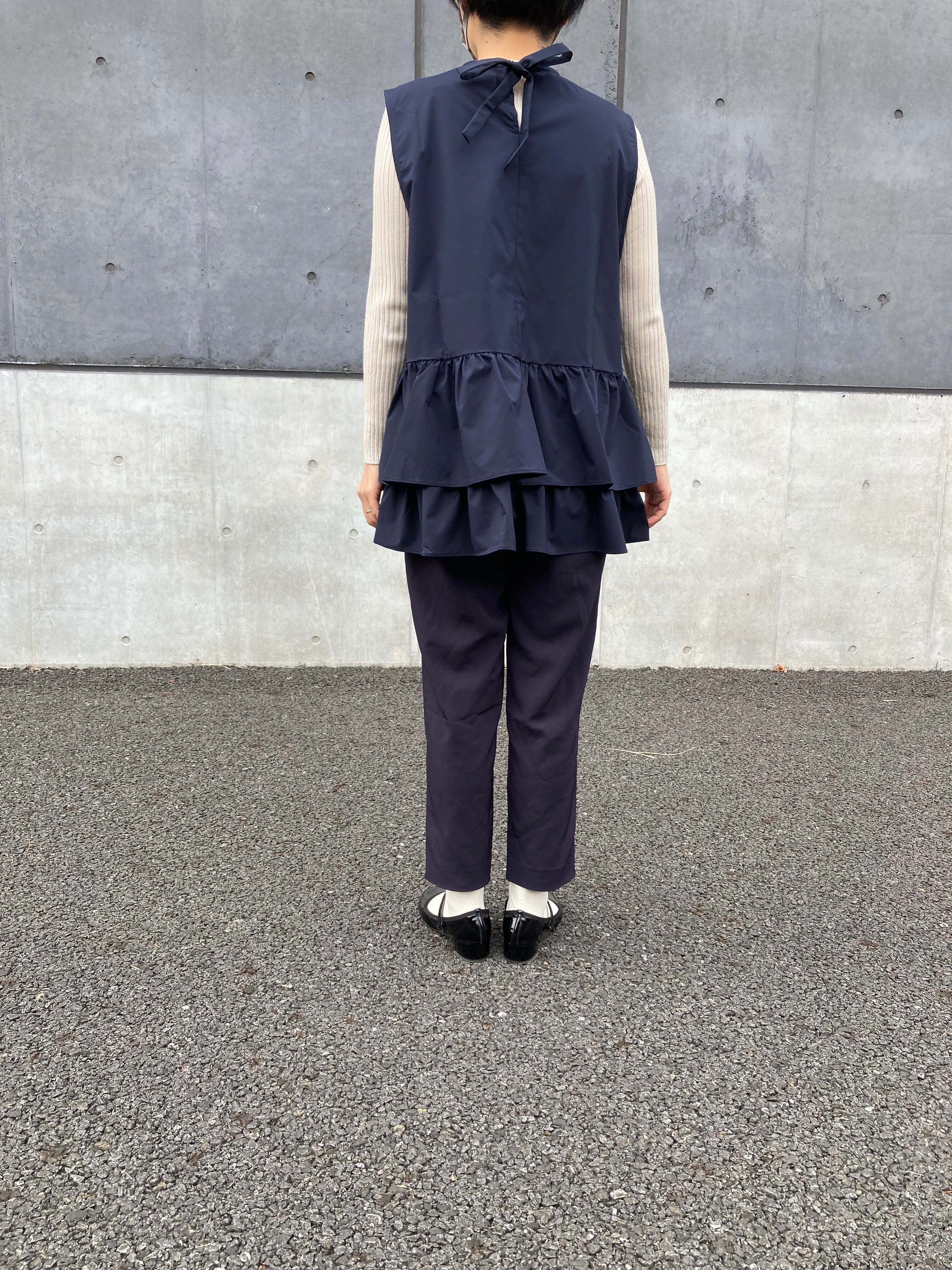 ウエストの切り替えに二段フリルをいれ、裾広がりのデザインと後ろリボンがポイントのペプラムフリルベストです。