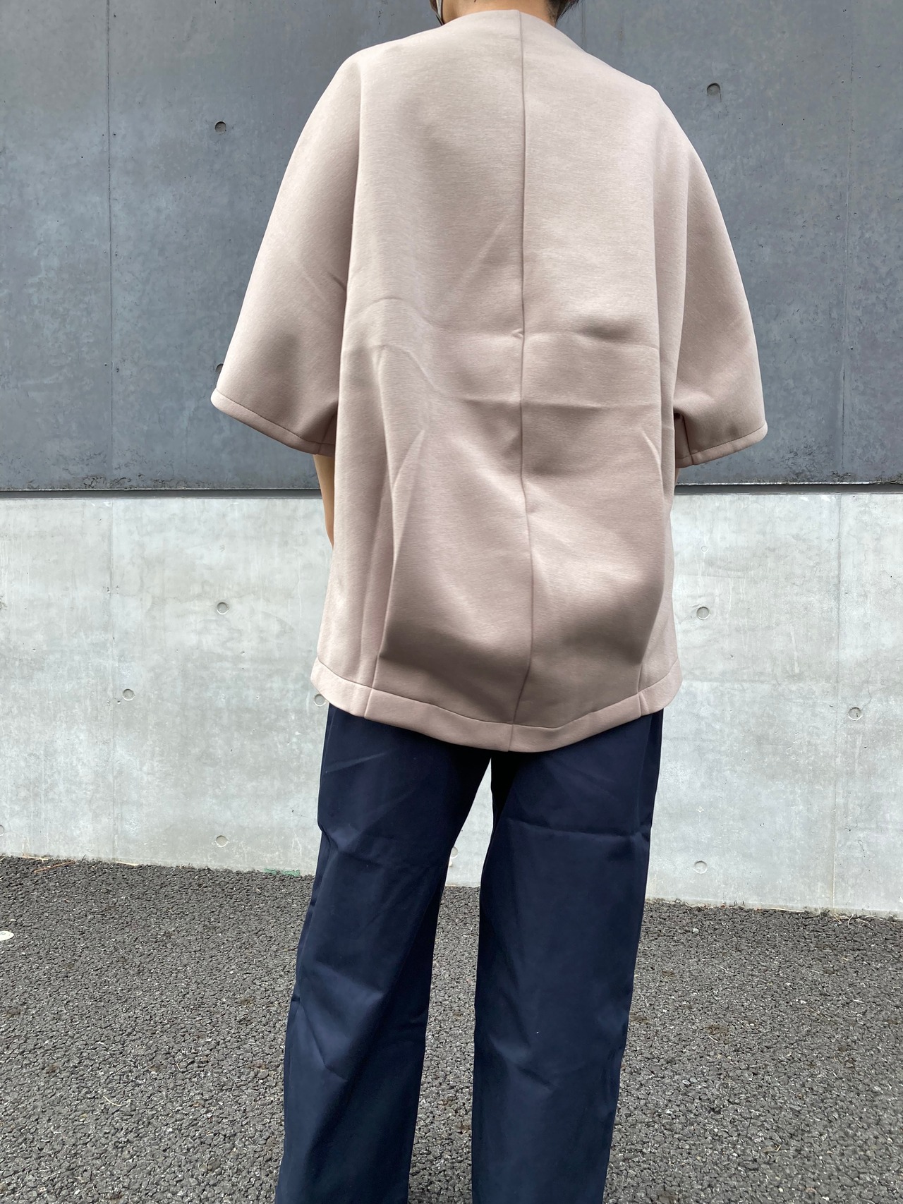 背中にふくらみを持たせるコクーンシルエットのデザインと、裾のタックが特徴的です。