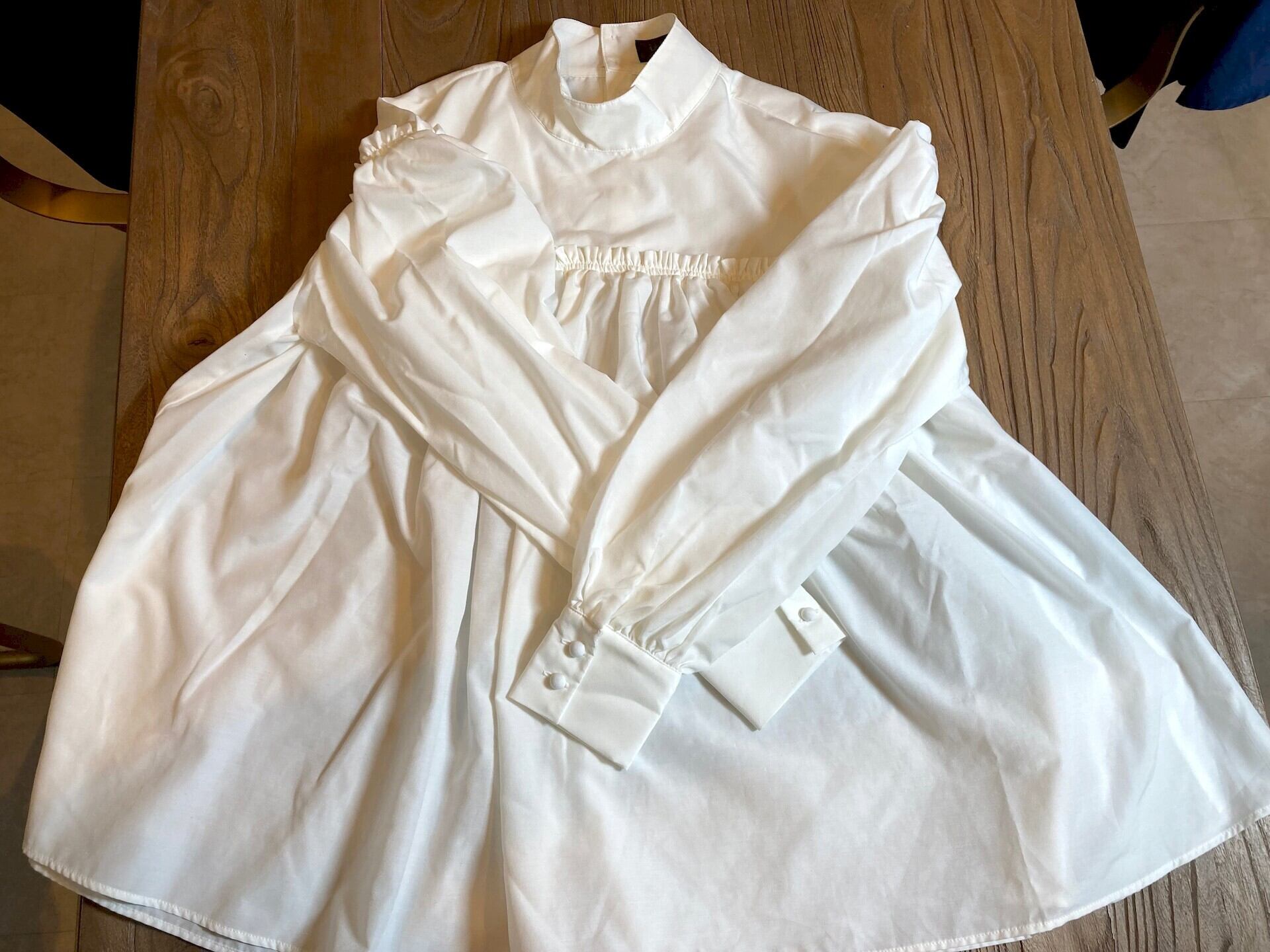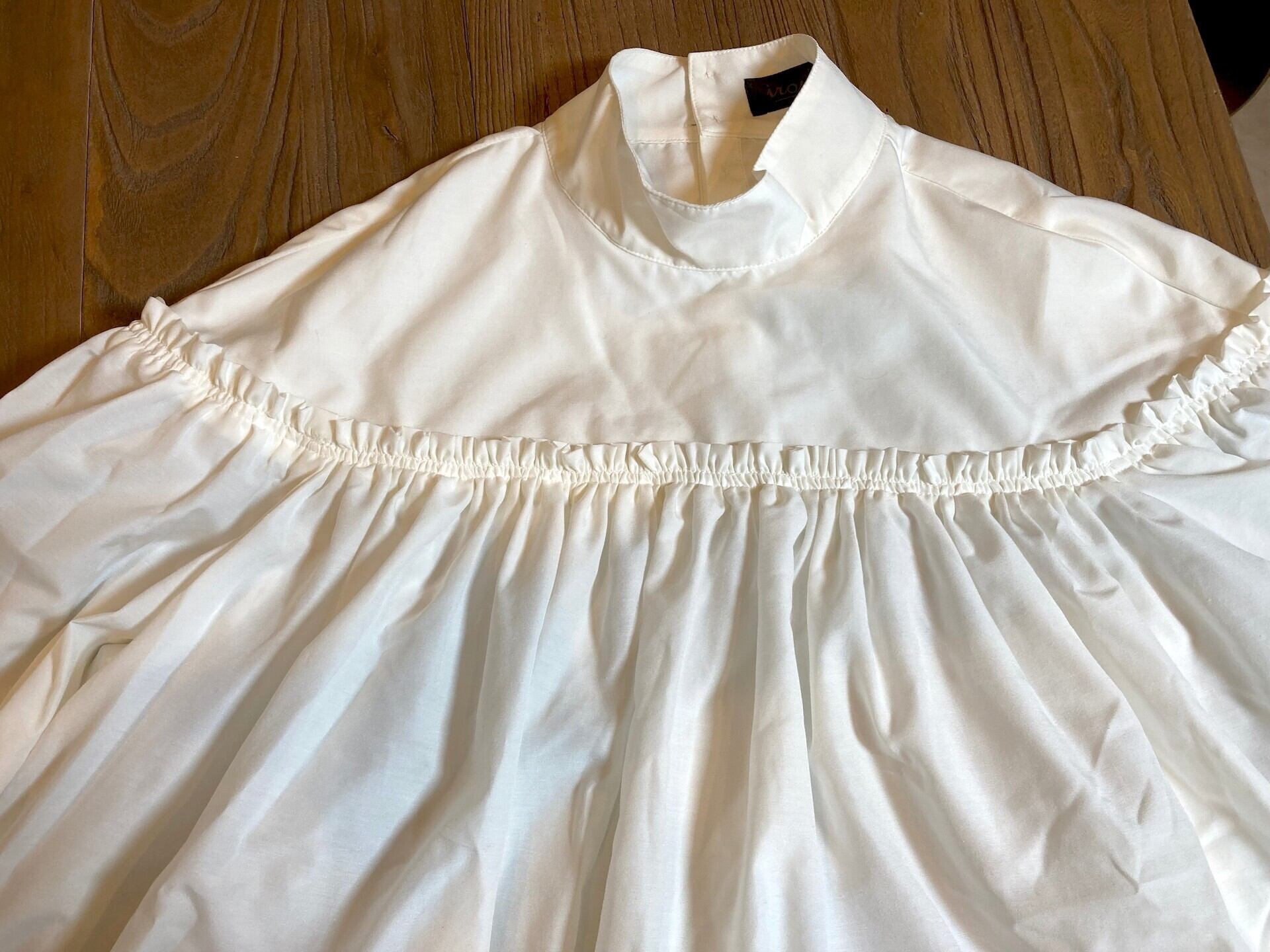 胸元の切り替え部分にギャザーをたっぷり入れたハイネックブラウスです。