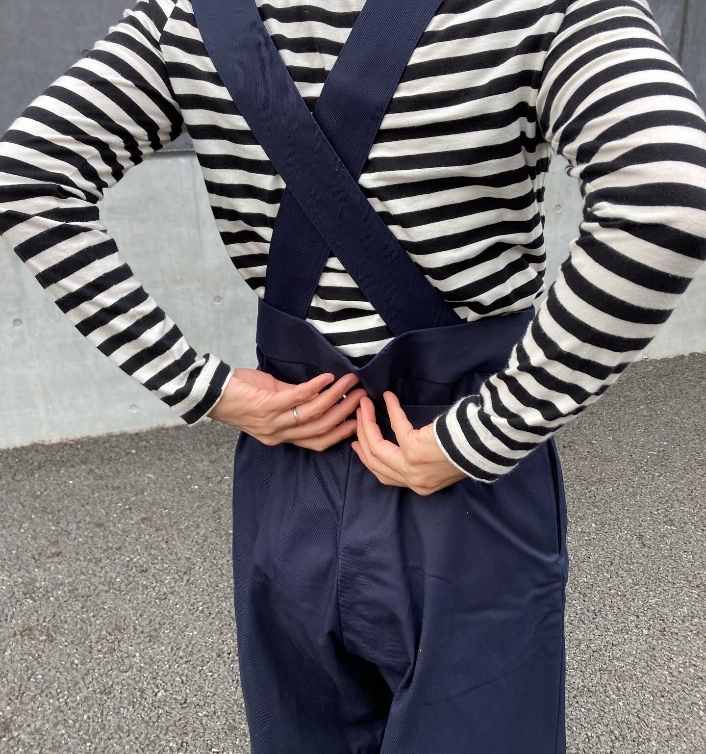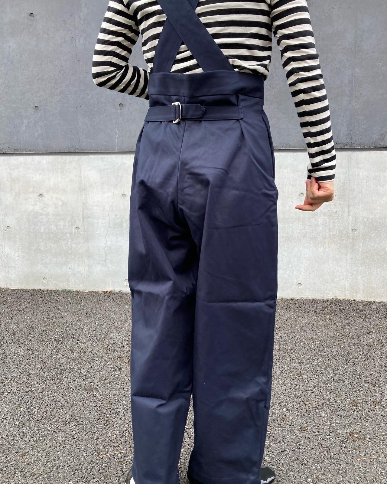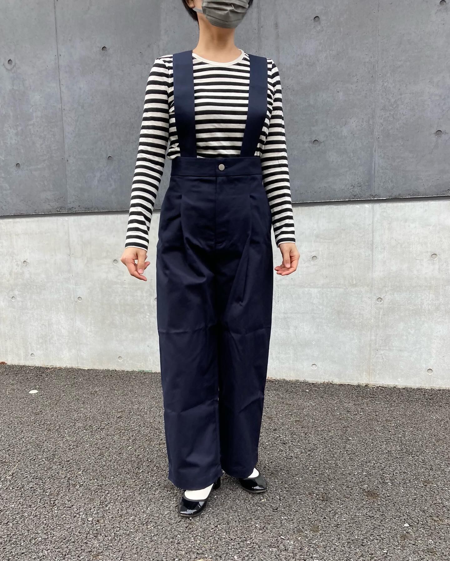 取り外し可能な肩暇ベルトが付いたタックワイドパンツです。